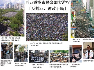 反對香港二十三條立法 港人大遊行 舉世矚目。香港四十多個團體發起的反對基本法第二十三條立法「七.一」大遊行,有近五十萬市民參加,這是香港自一九八九年「六.四」事件以來最大規模的遊行。香港和北京當局可以無視反對23條遊行人數多達超過五十萬,國際輿論卻極度重視五十萬人的聲音。西方各大通訊社昨日不停地報導香港大遊行的進展,美國《華爾街日報》的評論更直指港府無視民意。全球華人聲援遊行的聲浪不斷。多個外國駐港領事館也高度關注法案將對香港金融中心地位,造成極大影響。