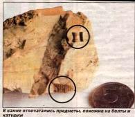 報導說,前不久在俄羅斯嘎盧戈州發現的石塊,經X射線分析,發現裏面含有8個類似繞線軸和螺栓的物體,而繞線軸和螺栓一般都是人工產物。根據科學家推測,石頭形成於古生代時期。按照達爾文的進化論,古生代時期在這個地球上還不存在人類。