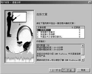 注意:在創建語音模式時,ViaVoice會請您選擇一篇文章進行朗讀,並告訴您這篇文章的語句數、朗讀所需要的時間、(分析)處理所需要的時間(如圖1)。如果系統認為您的朗讀符合要求,則錄音成功。接下來是進行語音分析處理或繼續朗讀。繼續朗讀可以使系統對更多的數據加以分析,讓ViaVoice盡可能地了解您的語音以保證較高的識別率。