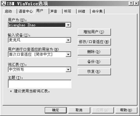 用錯誤的用戶名聽寫將導致很差的識別率。要選擇您的用戶名,單擊「開始/程序/IBM ViaVoice/工具/ViaVoice選項」,彈出如圖所示窗口,然後單擊用戶標籤,在「用戶為」下拉列表框中選擇您的用戶名,最後單擊[確定]。如果是一個新用戶,必須先添加,方法是單擊[增加用戶],在增加用戶的嚮導下一步一步完成添加工作。