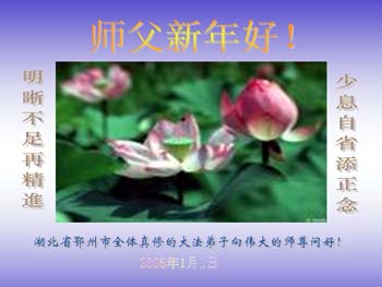 2005年元旦將至,煙台大法弟子向尊敬的師父問好!我們會按照師父的要求,努力精進,助師正法,讓師父放心。