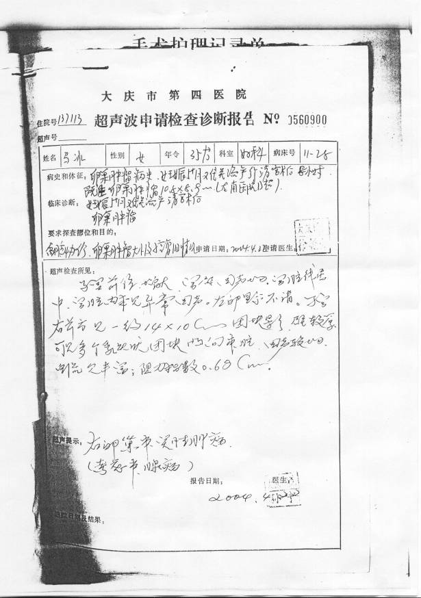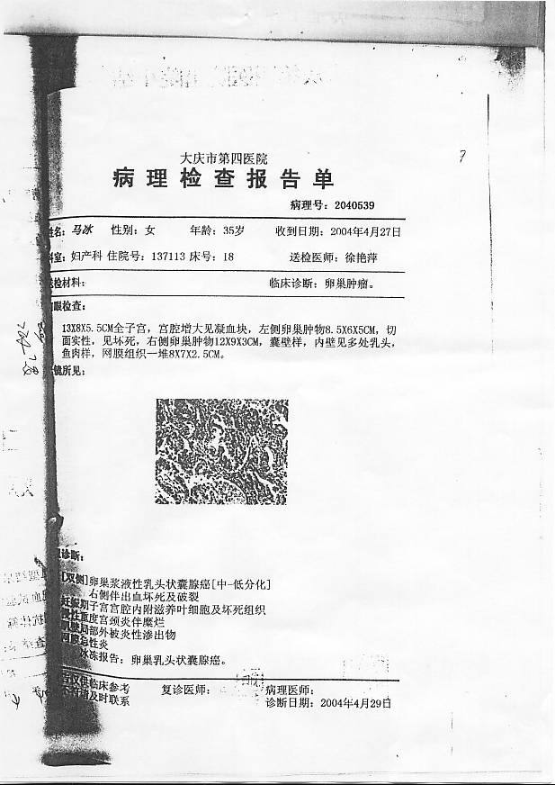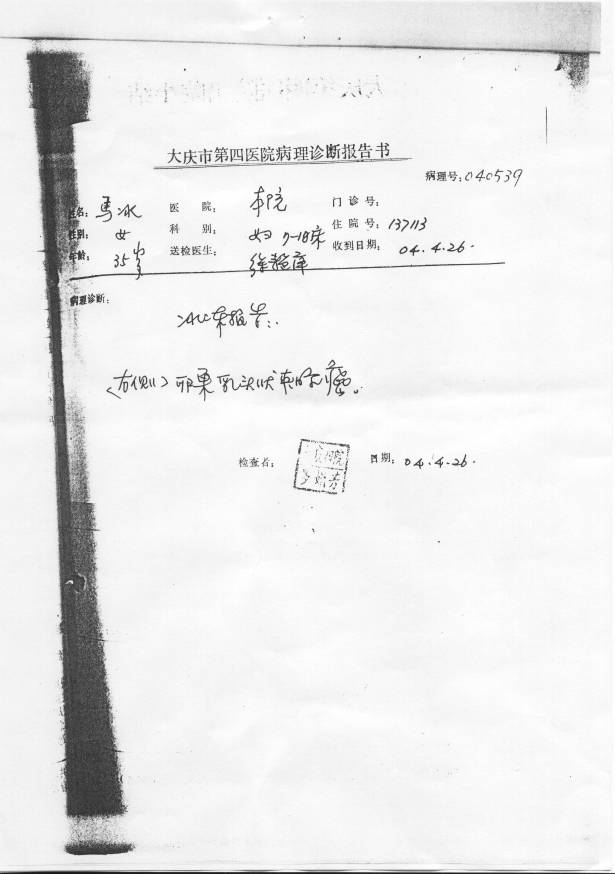 2003年秋,馬冰在工作崗位被該廠領導指使一夥惡人將她綁架到大慶紅衛星洗腦班,強行「轉化」迫使她放棄修煉。經此迫害後,她腹痛、腹脹、腹大異常,經大慶第四醫院檢查腹內有一囊腫,隨著囊腫的長大確診為腫瘤且同時懷孕,至2004年4月嬰兒五個半月時流產後夭折,同時檢查確診為卵巢癌晚期。4月26日馬冰癌症手術後發現癌細胞已擴散,胃、大網膜、腸管、子宮已布滿了大大小小的腫瘤,經切片,醫生失望的說她「癌症晚期,已經擴散了」。當醫生的媽媽看到從女兒腹腔取出的一大盤癌變物質,而且還將要切除子宮,她禁不住為女兒傷心落淚,多年從醫經驗告訴她:女兒沒救了!