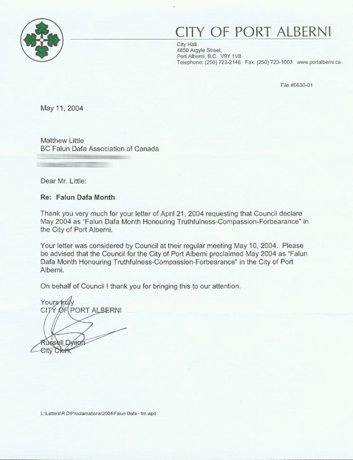 在5月11日的例會中,您的來信已獲得市議會的關注。在此通知您市議會已宣布2004年5月為帕特阿爾本尼市「嘉獎真、善、忍的法輪大法月」。