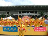 為了使更多有緣人得大法,我在家中成立九天班、讀書會;附近港和兒童公園成立煉功點;在學校我常把自己在大法中悟到的法理有意無意的溶在教學內容中,學生在潛移默化中,有些想修煉法輪功,於是我在學校成立了法輪功社團。我還利用寒暑假集合同修力量向教育局洪法,辦理教師法輪功身心靈健康研習營,廣鋪線路使與大法有緣者不至於落下。我得法時就面臨江氏政府無理的打壓,對大法鋪天蓋地的污衊造謠抹黑。為了固守台灣這片修煉淨土,我集合同修在高雄市挨家挨戶發真象材料,逢人講述大陸北京天安門廣場自焚的真象,台灣同胞普遍都能清楚大法被抹黑打壓的事實,約半年才把高雄南區真象材料發完一遍。最近基於洪法的需要,克服種種困難成立了高雄腰鼓隊,處處體現同修整體合作洪法講真象的那份純淨的心。