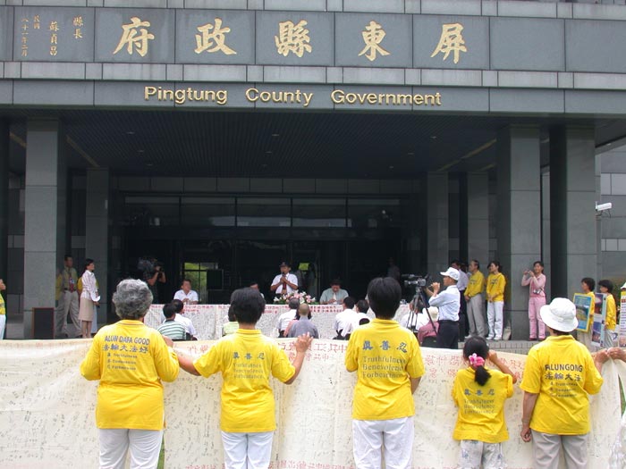 到各鄉鎮公所徵簽的學員,特別受到鄉長、議員、代表的支持,都同聲譴責江氏集團的暴行。三地門鄉長直接了當表示他想煉法輪功很久了,隔天我們馬上就安排學員上山義務教功,鄉公所內的員工也紛紛簽名聲援。另外潮州鎮、裏港鄉、高樹鄉、九如鄉、萬巒鄉等鄉長不僅簽名,還在徵簽布條上寫了請中共尊重人權的呼籲。幾天下來,已有二十個鄉鎮長及多位議員代表簽名支持。