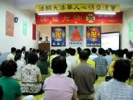 2004年6月26日,大費城法輪功學員應邀參加費城北部「信聖經無派別教堂」組織的「路上無暴力」社區活動。法輪功學員表演了五套功法,腰鼓,扇子舞,和舞獅,引起人們熱烈的掌聲。功法表演後,學員當場教功,很多人都饒有興趣的學煉了功法。