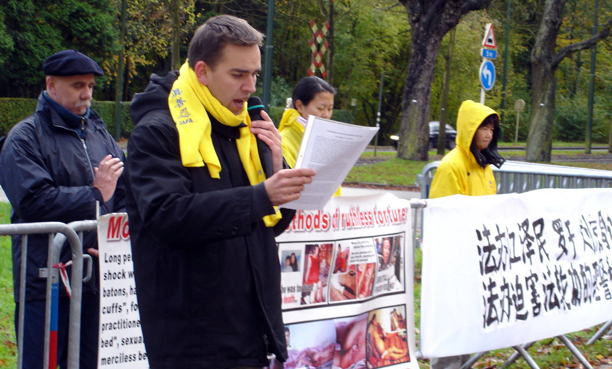 活動的最後,法輪功學員將中文《法輪大法學會公告》用信封封裝,投遞到中領館的郵箱;將一份《公告》的法文拷貝送與在此值勤的警察,告訴他們這就是今天下午宣讀的文件副本。活動在警察的謝謝聲中結束。