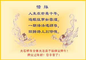【明慧網2005年2月10日】2005年2月8日是中國陰曆甲申年的最後一天,也叫「除夕」,來自漢城及周邊地區的60餘名華人法輪功學員歡聚在漢城教大室內煉功點,學法、煉功、交流、觀看新唐人新年晚會、寫真象信件等,在忙碌而又充實中度過了一個除夕之夜。