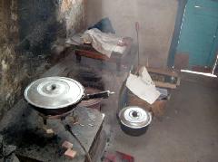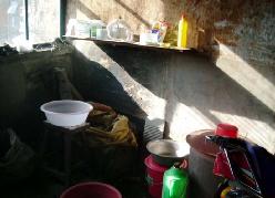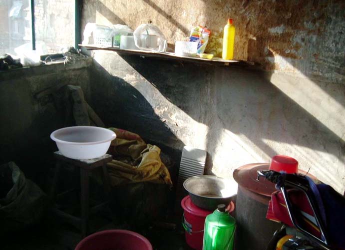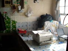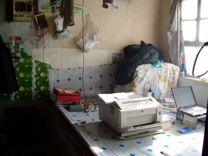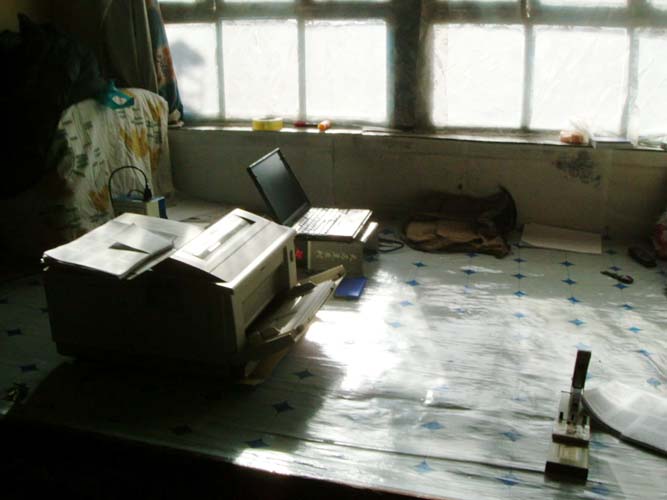 這些同修非常節儉。租住的都是低矮的舊式平房,這四張照片是其中一位同修的住所。「外屋1」是僅有的炊具和菜板(爐子旁邊用布蓋著的是菜刀和鏟子,還有半棵沒吃完的白菜。──他們常年的菜就是白菜、土豆、豆角、茄子);「外屋2」上部放的是洗衣粉、香皂、洗滌劑、從同修那裏拿來的代替刷牙杯子的飯缸,地上是臉盆、水缸、煤、洗衣板。「裏屋1」和「裏屋2」拍攝角度不同、內容相同,「裏屋1」可以看見低矮的、冬天為了防寒而釘著塑料的窗子;「裏屋2」是一台二手的佳能830激光打印機、二手的IBM 600E筆記本電腦,為了使用角度能方便一點,筆記本電腦下墊著一個紙盒。