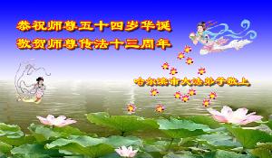 在師尊五十四華誕暨傳法十三年來臨之際,哈爾濱全體大法弟子向師父問好!我們無法表達對師尊的感激,用甚麼語言能傾訴弟子的心情啊!我們唯有真正按照師尊指引去做,盡心做好三件事,才能不愧對大法弟子的稱號,不辜負眾生的苦苦企盼,才不會辜負師父的慈悲苦度。我們一定會走好最後的路。