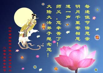「月圓之夜人不歸,花香之地無和平。」您知道嗎?六年來,江氏集團對法輪功的迫害,造成了眾多家庭妻離子散、骨肉分離、甚至家破人亡,眾多年幼的孩子因此失去了父母。然而加害他們的理由卻是那麼簡單──只因為一種基於對真、善、忍理念的遵循,卻付出如此的代價,他們何嘗不想一家人在一起過個團圓節呢?而這千千萬萬的家庭,哪個沒有自己的親人、朋友、同事、同學、鄰居……所有的法輪功學員,沒有誰能體會他們、他們的家人在遭受著甚麼!