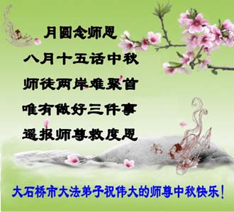 「善待大法一念,天賜幸福平安」,善良的世人啊,為了您和您的家人能有個美好的未來,明月當空,在和您的家人團聚之時,別忘了,聊聊法輪功,互相提醒,請記住「法輪大法好」、「真善忍好」,不要參與迫害大法及大法弟子,因為這對每個人的生命真的很重要。
