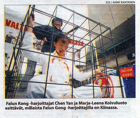 許多拉赫蒂(Lahti)的民眾注意到藍納(Lanun)廣場上,有一位被毆打很嚴重的中國婦女被關在籠子裏。這些傷痕不是真的,所要傳達的信息是:過去六年在中國的法輪功學員所遭到的酷刑、虐殺及逮捕。