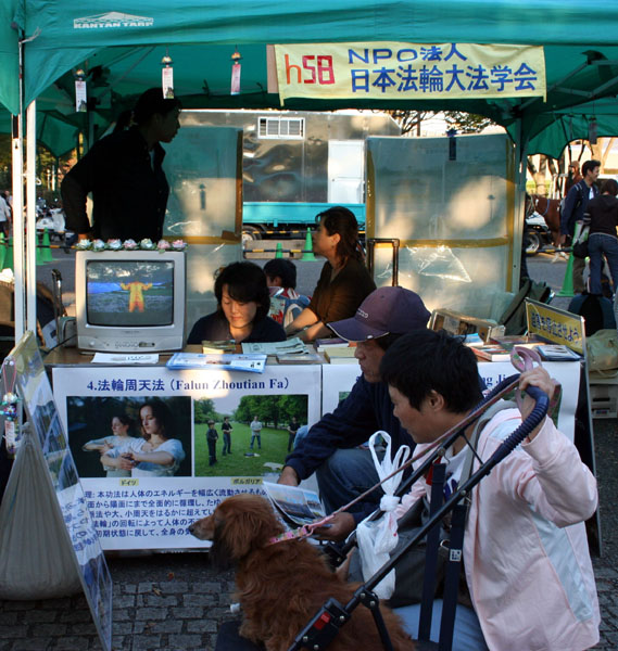 有一位日本男士到學員們的攤位上講,他曾經在好多車站接過法輪功傳單,得到的信息主要是法輪功在中國怎樣被殘酷迫害,他也買過大法書籍。今天在這種正式的場合再一次碰到法輪功讓他驚奇。學員們跟他交流了很多內容,包括中共為甚麼迫害法輪功,不僅是因為煉法輪功的人多了,而且煉法輪功的人是有自己的獨立思想,按照「真善忍」的原則判斷一件事情的好壞,而中共一直是對自己的人民進行著洗腦,靠謊言和暴力維持統治。就是因為法輪功是有自己的信仰,會獨立思考,不會盲目聽從中共的謊言,所以中共害怕法輪功,開始了殘酷的迫害。這位男士表示回去要好好讀一讀幾年前買的那本《轉法輪》。