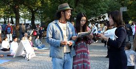 為了讓參加第三屆NPO節的NPO團體之間互相增加了解,二十日晚上主辦者開了聚餐會,自由報名參加。法輪功學員參加了這個聚餐會。在自我介紹時,一位日本人學員介紹說,在去年的NPO節上,她的一個朋友接到了一份法輪功的傳單,覺的好,就給了她,就這樣她開始修煉法輪功。她非常感謝NPO節,希望大家都能接受法輪大法傳單。