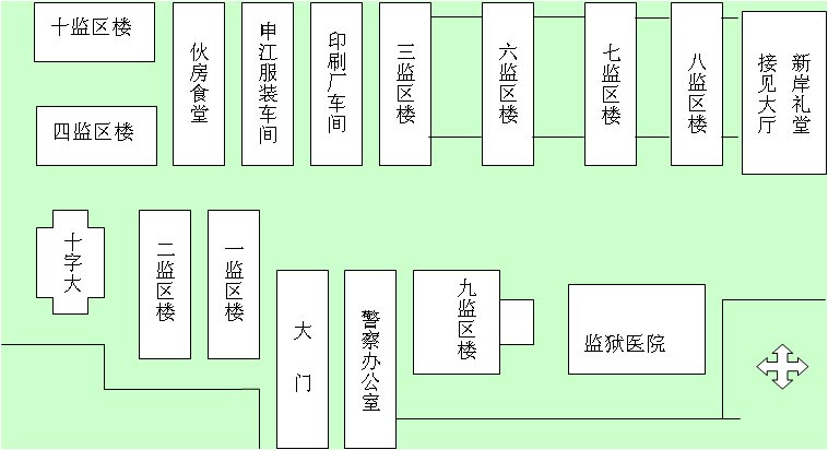 四監區生活區樓是迫害大法弟子的場所,用酷刑「窄凳子」虐待逼迫大法弟子認罪勞動。該樓中囚犯按圖中所示虛線走到申江服裝廠車間大樓的服裝流水線生產出口的勞改產品。在2001年,提籃橋監獄四大隊加班加點生產公安人員新制服(華東六省一市的所有警察制服全部由提籃橋監獄生產。當時犯人每天工作15小時以上,大多數犯人休息只能和衣而睡。