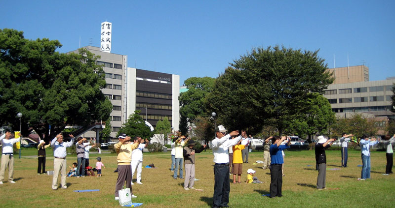 十月的熊本正是晴空萬里的秋季,十九日天氣格外輕爽,上午十點,前來參加法會的法輪功學員在白川公園集體煉功。煉功場的兩側高掛法輪大法的旗幟;而面向人行道,則整齊擺放了介紹了法輪功在世界各地的洪傳以及在熊本普及的真相展板。另外, 學員還準備了揭露了中共對法輪功的殘酷迫害的真相資料。