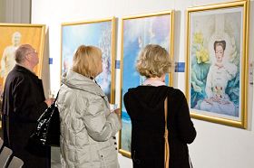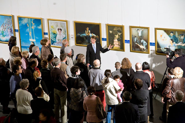 致辭之後,參加開幕式的人們在畫展主辦者德國「藝術和人權協會」會長第茨先生的解說下觀賞了每一幅畫,對於一些畫作中表現的法輪功學員受到中共警察酷刑折磨的情景,很多人露出震驚的表情。也有很多人對表現法輪大法美好的畫作很感興趣。開幕式結束後一些人找到在場的法輪功學員詢問學功事宜。
