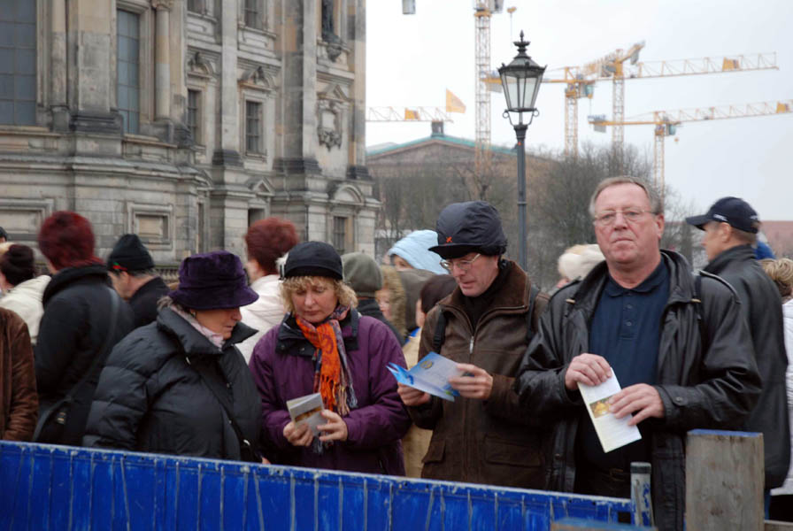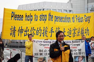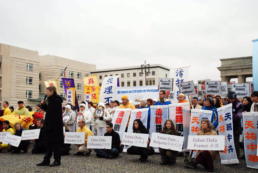 十五日中午十二點整,遊行隊伍聚集在亞納維茲橋(Jannowitzbruecke)上的中領館前,歐洲法輪大法協會主席吳先生在發言中表示,法輪功使上億人身心健康,對法輪功的迫害實質上是中共邪惡本性使然,是對全人類的迫害。