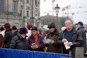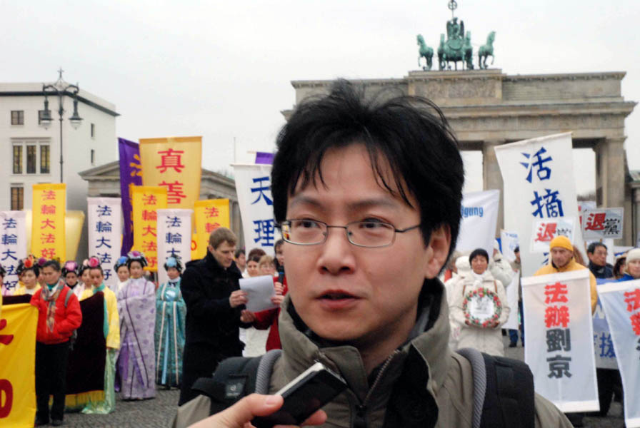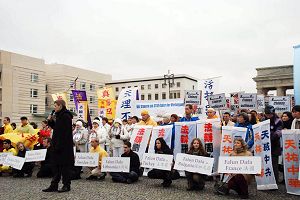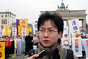 一對中國夫婦在布蘭登堡前看熱鬧。這位妻子向記者表示:「法輪功了不起!我不是法輪功學員,但是這些年來我看著他們做的很多事,我覺的真是……今天的集會太好了,那麼大型的活動,我都感動的忍不住哭了。我覺的這樣的熱鬧應該有更多的中國人來看,用自己的眼睛看看到底發生了甚麼。」她還告訴記者,她會把她在國外看到的告訴國內的親友。 她以前就這樣做,但她認為那還不夠,以後她會做更多。