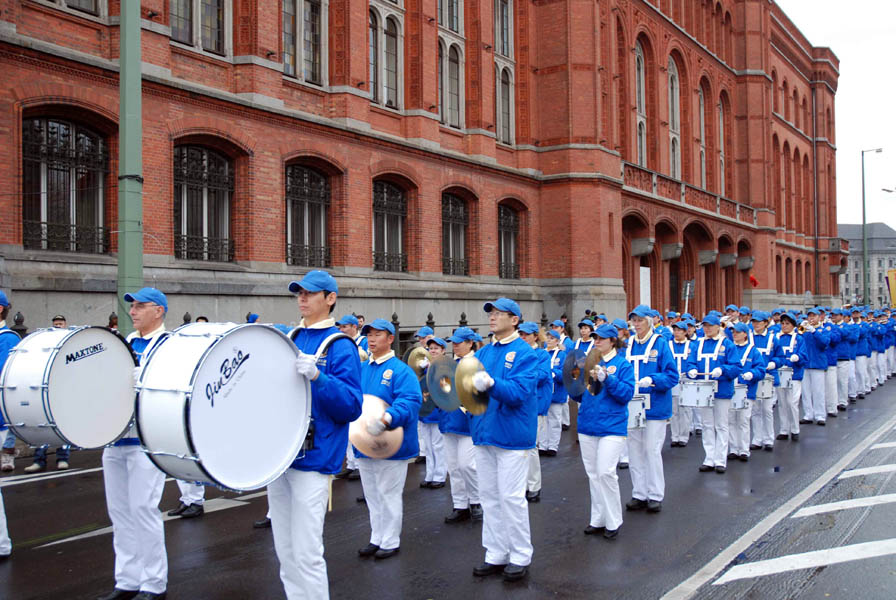 遊行由來自歐洲各國一百二十人的天國樂團開道,藍衣白褲在灰色的天空下分外鮮明。緊隨其後的橫幅隊,「法輪大法好」、「真善忍」等橫幅默默傳達大法弟子的心聲。腰鼓隊金衣閃閃,唐裝舞和彩車花團錦簇,展示中共酷刑手法的遊動車則直白講述迫害的殘酷。