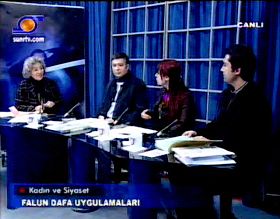 ![]() 節目主持人伊爾涵•阿堪女士(左一)與受邀接受專訪的法輪功學員們 |