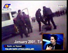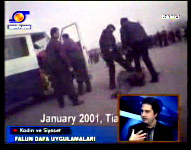 ![]() 電視上播出中共警察殘酷毆打法輪功學員的畫面 |