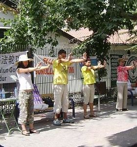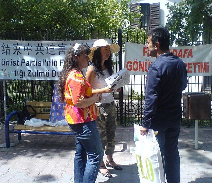 【明慧網二零零八年七月二十五日】二零零八年七月二十四日,土耳其法輪功學員在首都安卡拉市中心使館區公園裏揭露中共迫害法輪功的罪行,向過往的行人發傳單介紹法輪功並講述中共迫害真相。中共的罪惡,尤其是活體摘取器官等暴行,令人們震驚。有媒體記者追蹤採訪並詳細了解真相。
