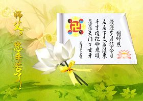 值此新春佳節即將來臨之際,弟子恭祝師父新年快樂!我們一定牢記您的重託,多學法,多除惡,廣救眾生,早一點迎接法正人間的到來!