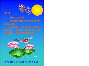 在這中華民族傳統的中秋佳節即將來臨之際,我謹代表朝陽區南湖中園的大法弟子向慈悲偉大的師父致以崇高的敬意,恭祝師父節日快樂。在這正法修煉的最後時刻,我們會越來越精進,抓緊一切機會,盡一切可能的救度更多世人,以此回報我們慈悲偉大師父的救度之恩。請師父放心。