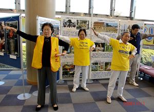 這是法輪功學員連續第四次參加飯島町一年一度的文化節。當地的很多民眾都已了解了法輪功。學員們在文化節的展位上煉功,向來參加文化節的人們發送法輪功的真相資料,很多人都願意接。