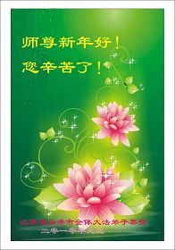 在二零一零年新年到來之際,鄭州鐵路局全體大法弟子恭祝偉大的師尊新年快樂!我們一定按照師尊的教誨,抓緊有限的時間,認真做好「三件事」,救度更多的眾生,完成我們的史前大願!感謝師尊的慈悲苦度,並向師尊合十叩拜。