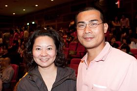 沐華國際美容有限公司總裁洪若萍和先生謝豐益,率領五十位經絡理療師團隊前來觀看神韻演出,洪若平表示,「剛開始聽說神韻多好多好那種感覺,我們親自來看後的感覺更是不一樣,真是百聞不如一見。整個節目的安排、配樂、舞蹈,把佛界、天界、人間融入戲中,這樣的融入,很震撼。」