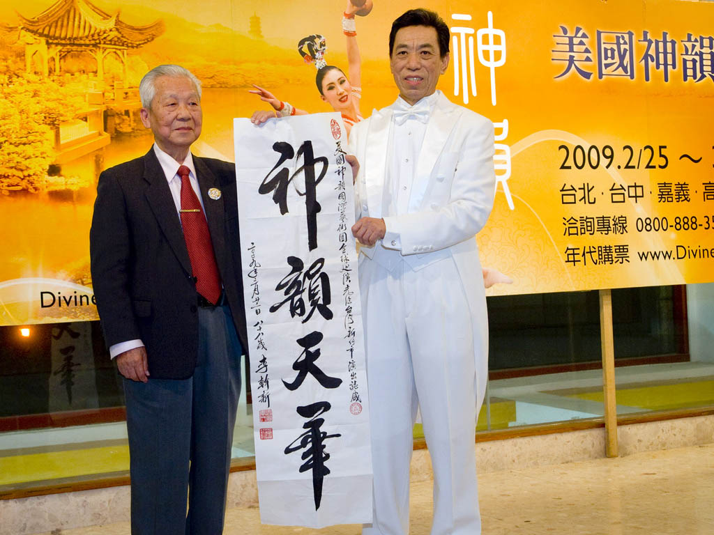 新竹壓軸場有許多藝術家爭相一睹神韻,其中享譽海峽兩岸藝術界,八十八歲高齡的李幹新因為觀看神韻之後感動至深,決定將親字書帖「神韻天華」四大字贈與神韻國際藝術團,由藝術團副團長關貴敏代表接受,關貴敏也於接受字書後,對台灣觀眾的熱情表示感謝。