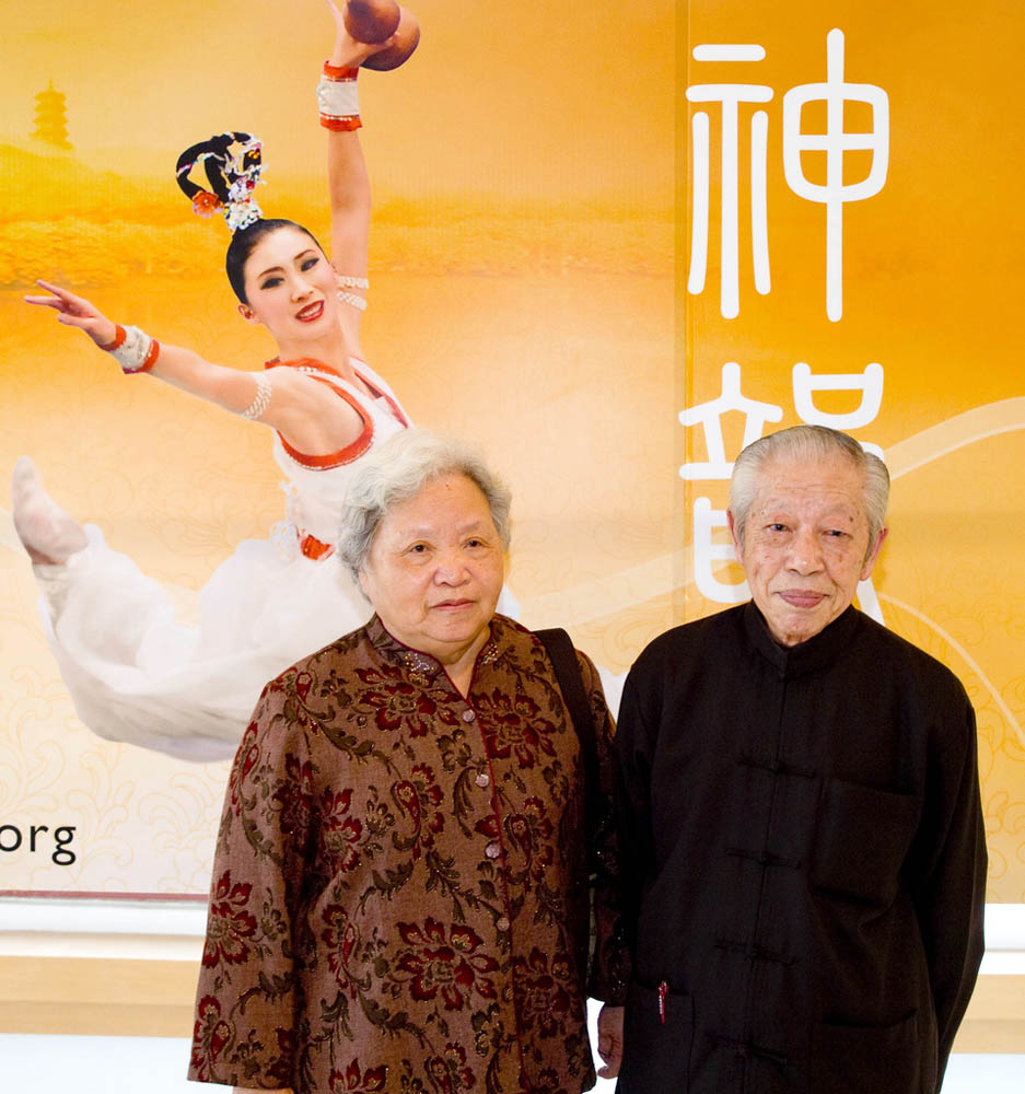![]() 書法家黃群英先生與夫人一同觀賞神韻三月廿二日下午在新出的演出 |