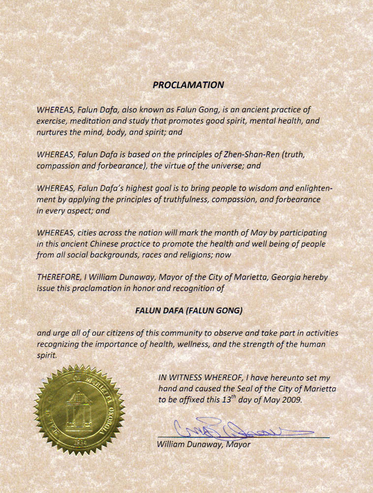 鑑此,我,喬州邁瑞亞塔市市長威廉姆•唐納維,為表彰法輪大法(法輪功),特頒發此褒獎令,並敦促本市的所有市民,認識到健康和人性的重要,參與這一慶祝活動。