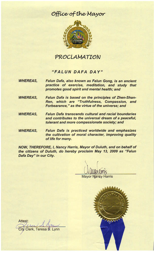 鑑此,我,德魯斯市(Duluth) 市長南希•哈里斯(Nancy Harris) 代表德魯斯市全體市民,宣布二零零九年五月十三日為本市「法輪大法日」。