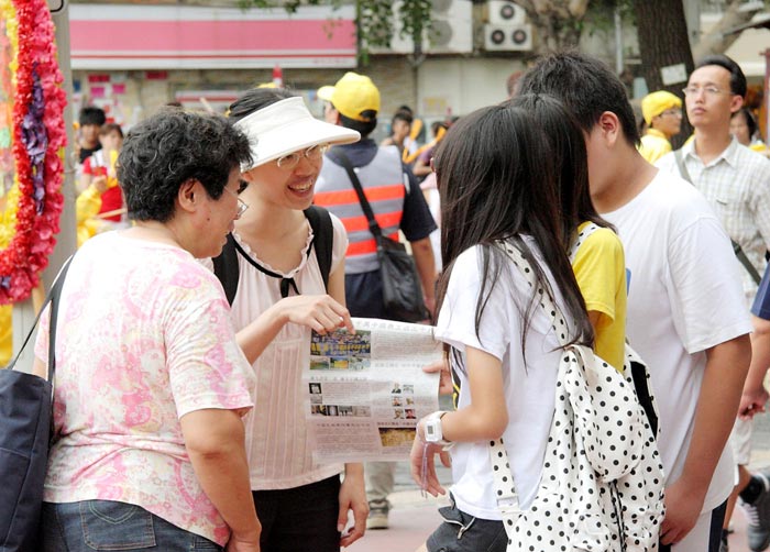 剛拿到聲援六千一百萬中國民眾三退特刊的莊小姐,坐在路旁的石階很仔細的閱讀,篤信佛教的她感慨地說,多行不義,必遭天譴,中共幹了這麼多壞事,老天爺一定會找它算帳的。