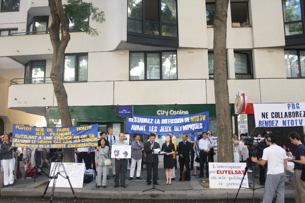 ![]() 新唐人電視台在位於巴黎的歐衛公司總部前舉行記者會,要求歐衛立即恢復其對中國大陸的信號 |