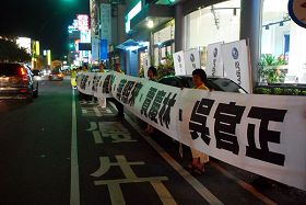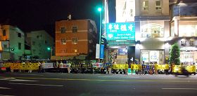 法輪功學員在趙正永住的嘉義市耐斯飯店外面拉橫幅譴責迫害