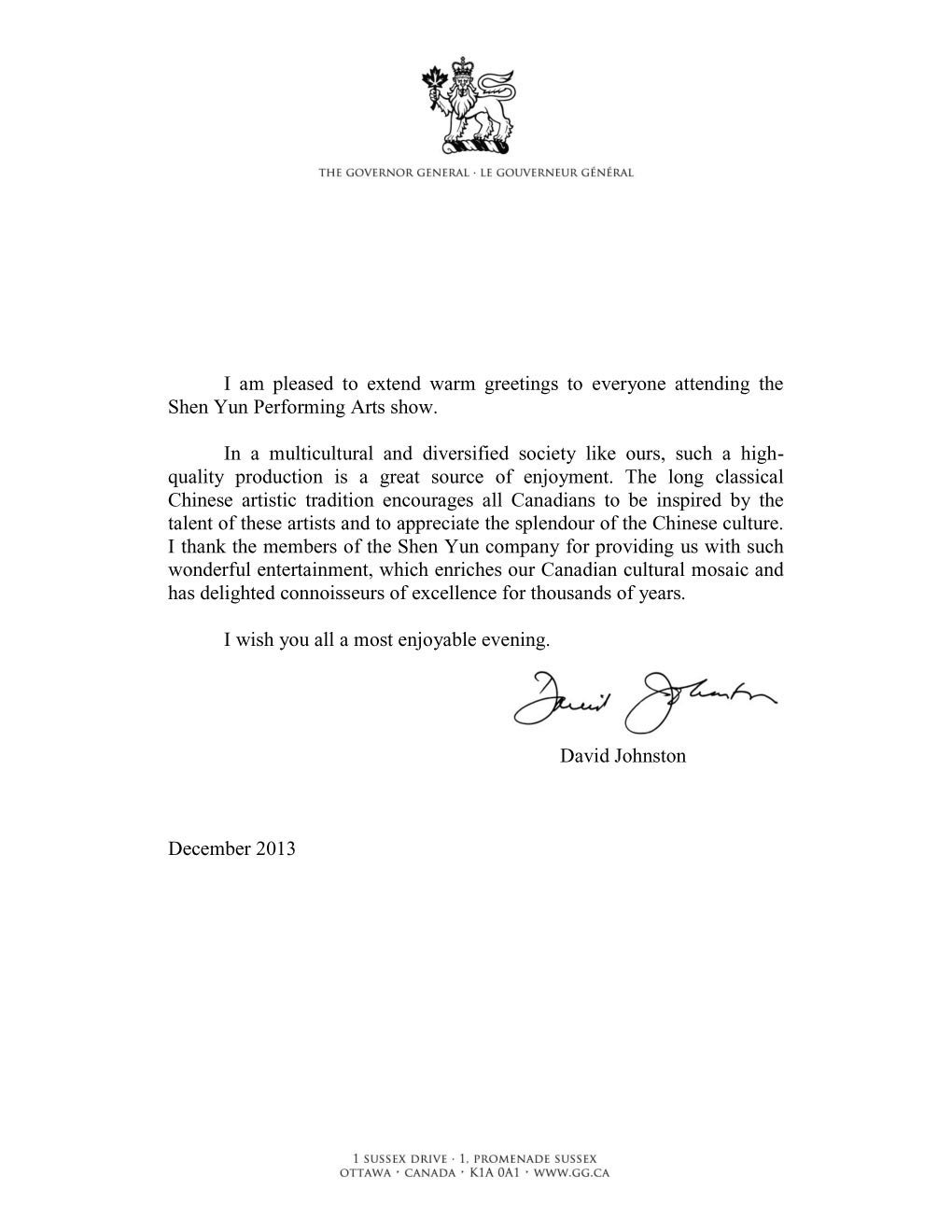 總督並在賀信中寫道:「源遠流長的傳統中華藝術傳統,讓所有的加拿大人接受著(神韻)藝術家的才華的啟迪,並欣賞到中華文化的壯觀絢麗。我要感謝神韻藝術團成員為我們提供了如此精彩絕妙的演出,(神韻)讓我們加拿大的文化大為增色。」
