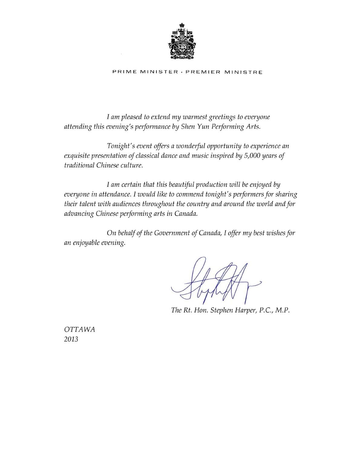 哈珀總理在賀信中說:「我非常高興能向今晚觀賞神韻演出的每一位觀眾致以最熱情的問候。今晚的(神韻)演出提供了一個體驗蘊含五千年中華傳統文化底蘊的中國古典舞和音樂的絕佳機會。」