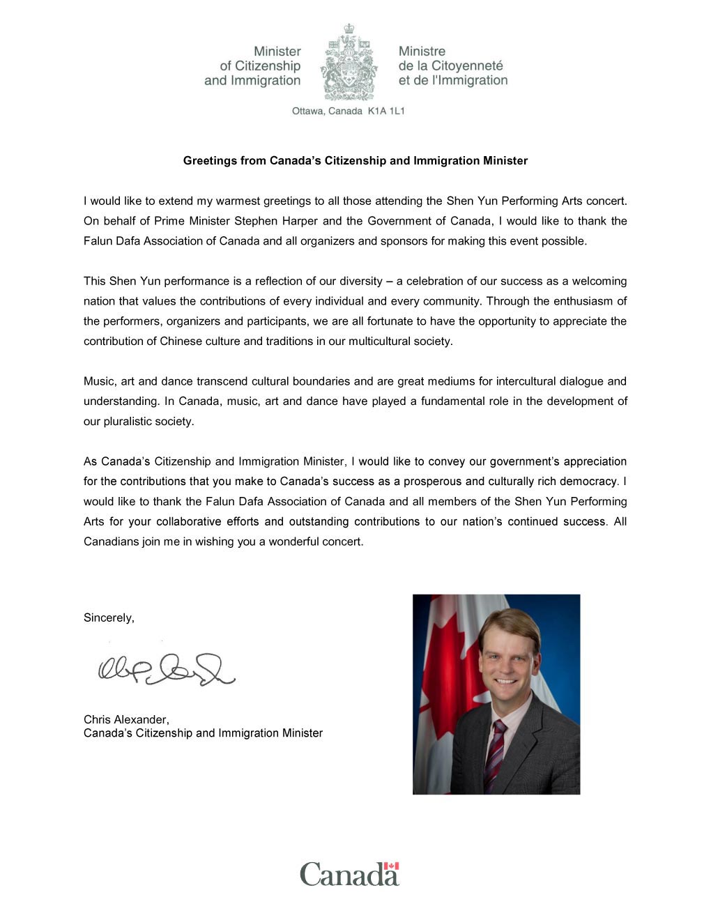 新晉聯邦公民及移民部長克里斯﹒亞歷山大(Chris Alexander)在給神韻演出發出的賀信中說:「我要向加拿大法輪大法學會和所有神韻藝術團成員表達感謝,謝謝你們為我們國家的不斷成功作出的努力和突出貢獻。」(移民部圖片)