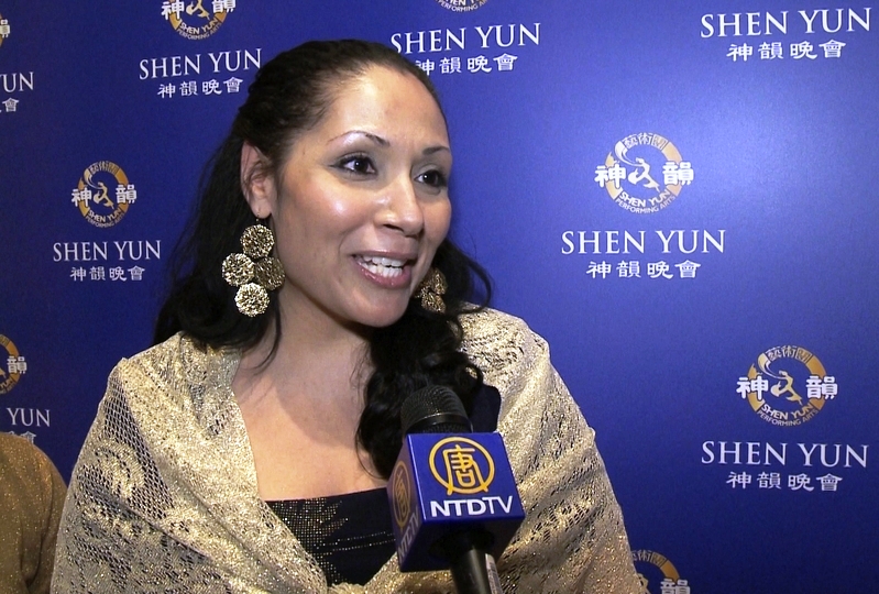 「神韻所有的一切都很精彩。她們在舞台上通過天幕和其他元素的結合,將中國古老的文化,在紐約這樣一個現代化的大都市上演出來。這非常的好。」她繼續說:「當今社會混亂,每個人都生活在緊張和壓力之中。神韻演出彷彿把我們帶入了一個世外桃源。我感覺很快樂。我現在很期待下半場的演出。而且我也迫不及待的想要讓我的朋友都來看神韻了。」