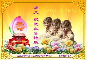 兩個法輪功小弟子想對師父說:「祝師父生日快樂!法輪大法好!」