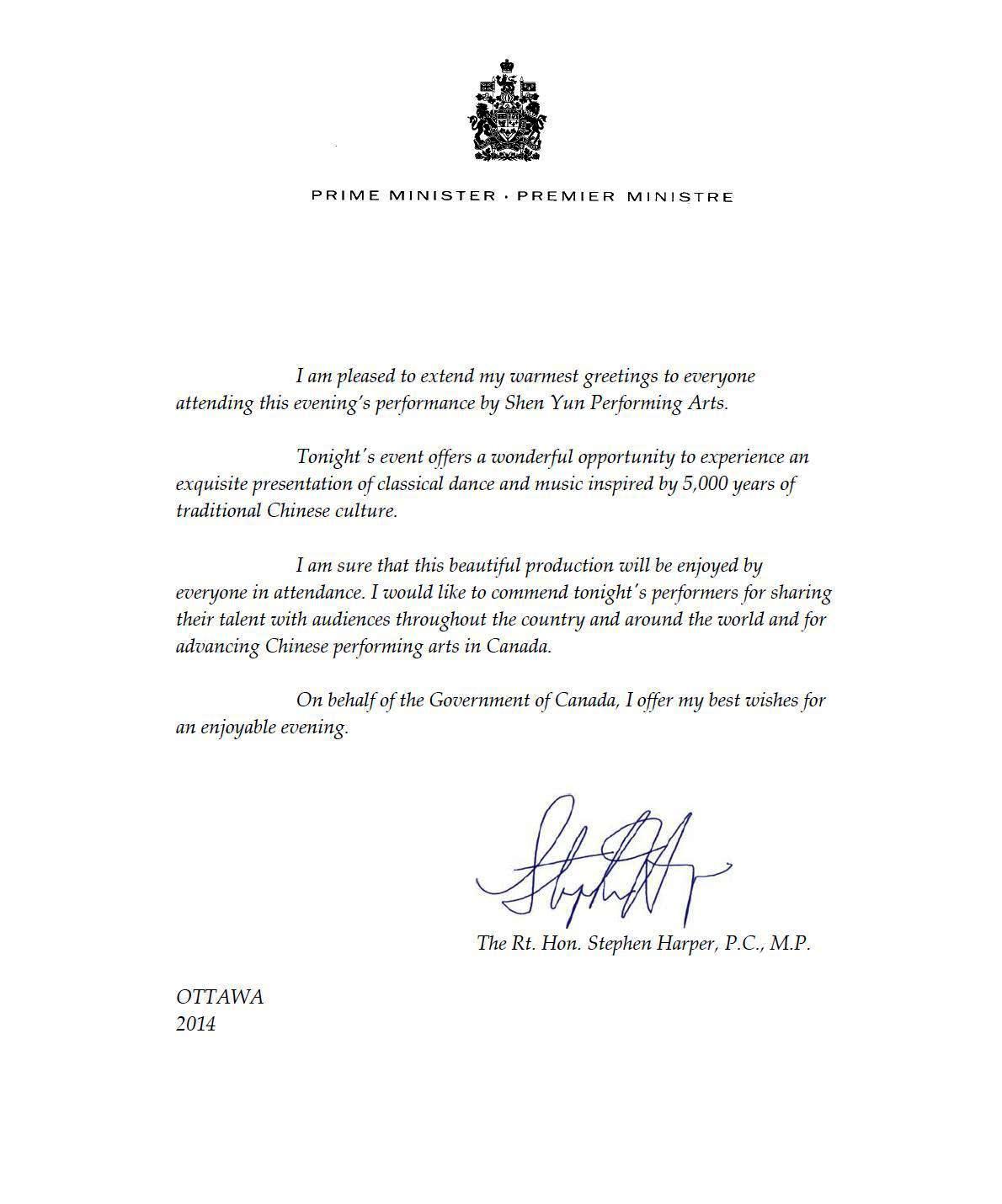 加拿大總理斯蒂芬•哈珀(Stephen Harper)自二零零六年當政以來,每年都為神韻發賀信。在今年的賀信中,哈珀總理說:「我非常高興能向今晚觀賞神韻演出的每一位觀眾致以最熱情的問候。」