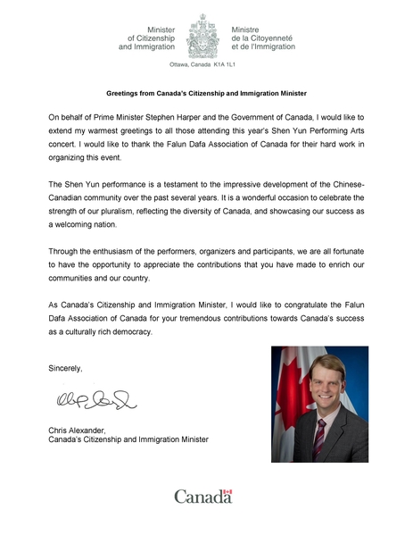 ![]() 聯邦公民及移民部長克里斯•亞歷山大(Chris Alexander)給神韻主辦方發出的賀信 |