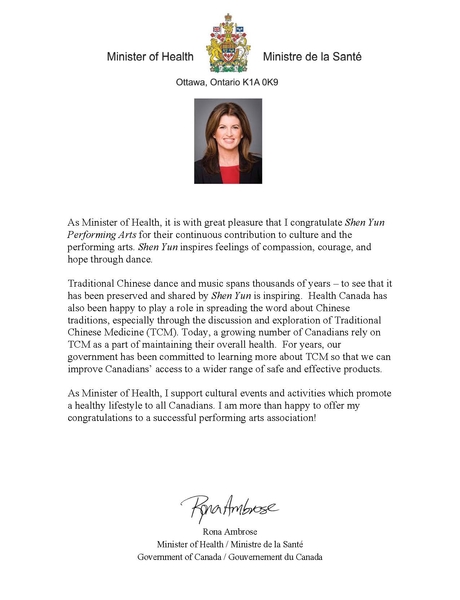 聯邦衛生和健康部長羅娜•阿姆布羅斯(Rona Ambrose)在賀信中寫道:「作為聯邦衛生和健康部長,我非常高興能夠借此機會向神韻藝術團道賀。神韻通過舞蹈激勵民眾欣賞善良、勇氣和希望。」