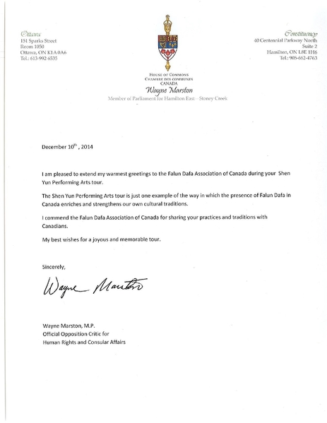 ![]() 加拿大國會人權委員會副主席、漢密爾頓東及石溪區(Hamilton East-Stoney Creek)國會議員韋恩•馬斯通(Wayne Marston)致神韻的賀信 |