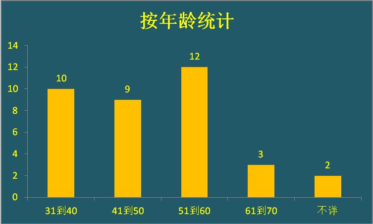 從年齡來看,36名學員中,年齡最大的是來自湖北的劉曉蓮(女,68歲),年齡最小的是來自山東的蘇剛(男,32歲)、河北的榮鳳賢(女,32歲)。總的來說,51到60歲年齡段最多: